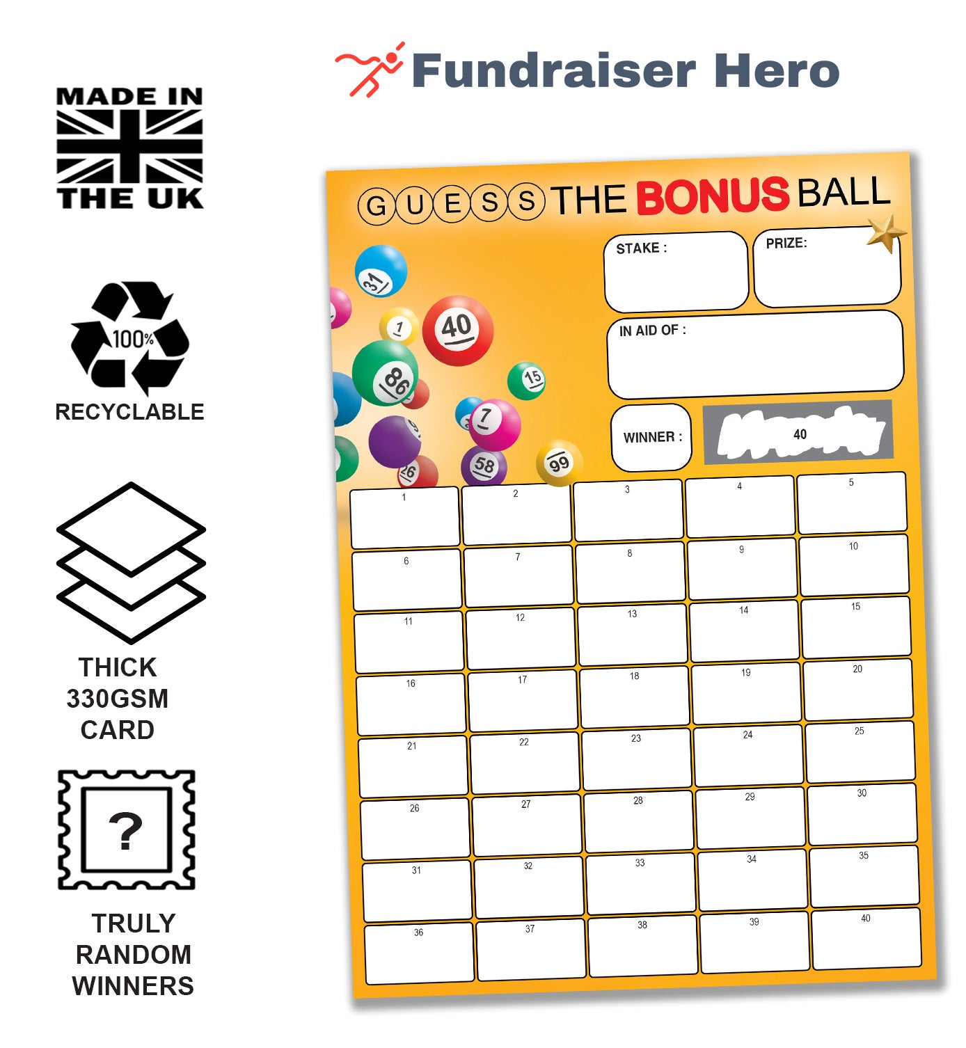 COMPUTER GENERATED RANDOM WINNERS ⭐ The scratch panel on each card hides a randomly generated number from the 40 available. Our production printers are linked to a computer generated routine that automatically picks a randomly generated winner when every card is printed. ⭐