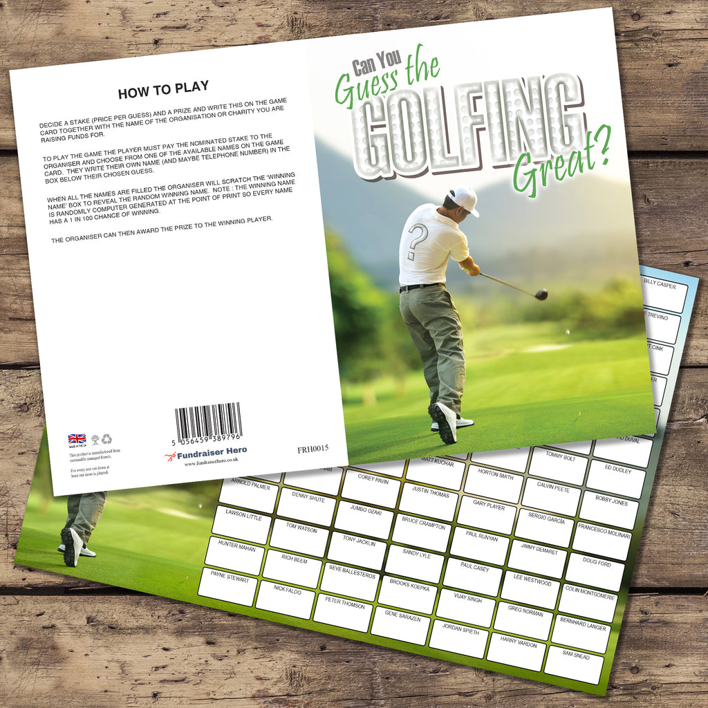 Name the Golfing Great Fundraising Scratch Card. A4 Size - 100 Names - Double Sided 330gsm Card
