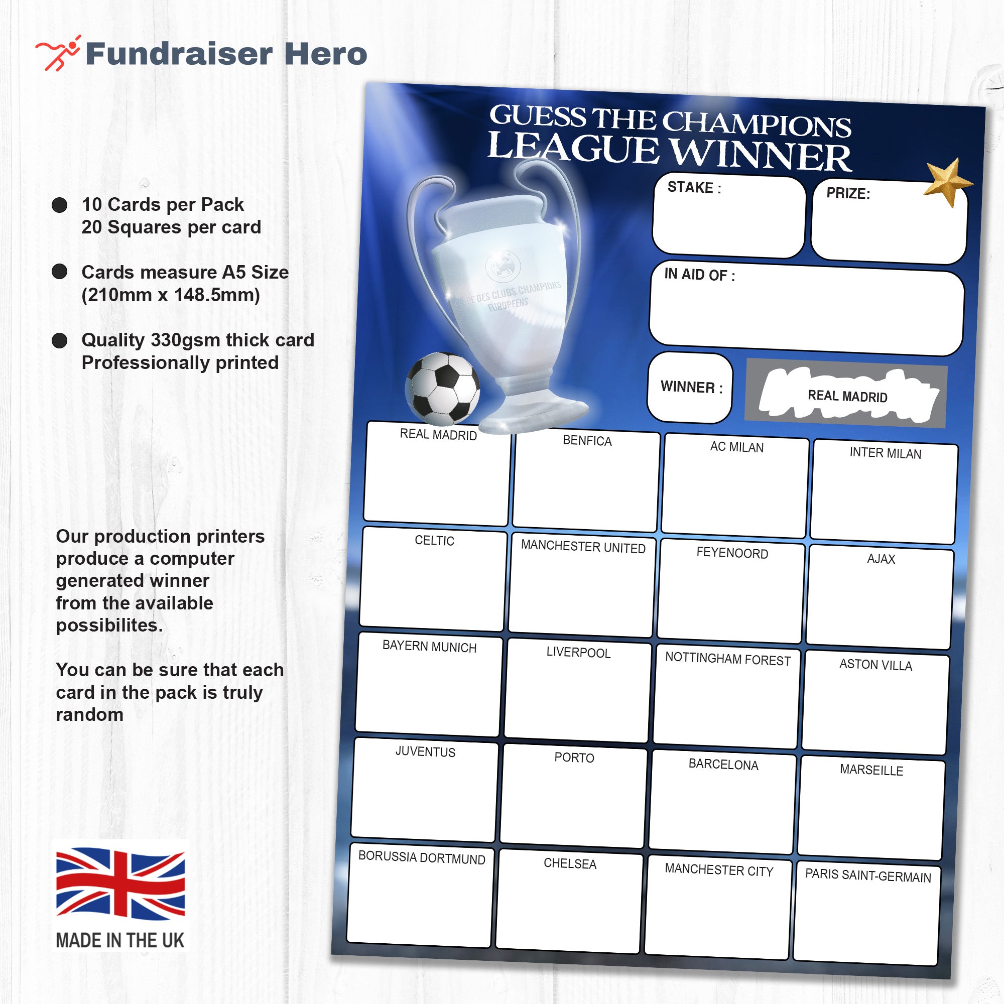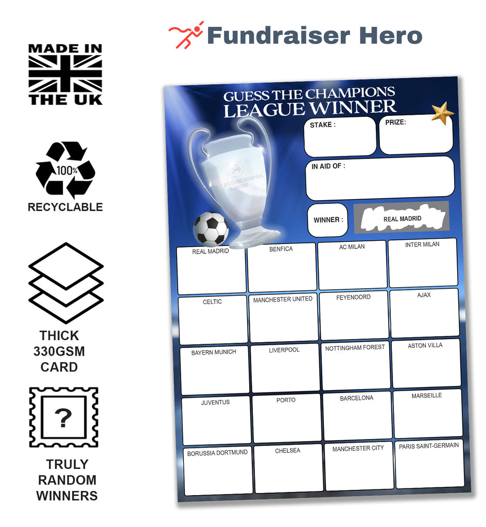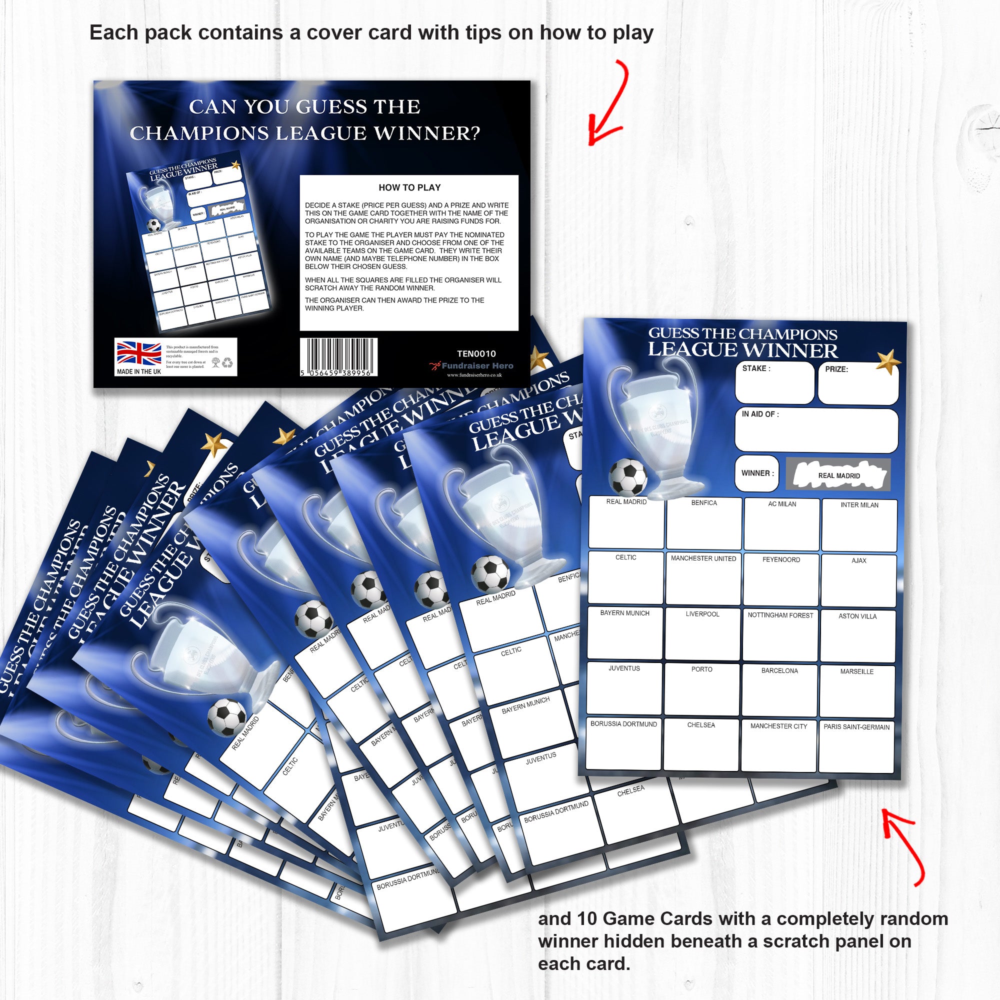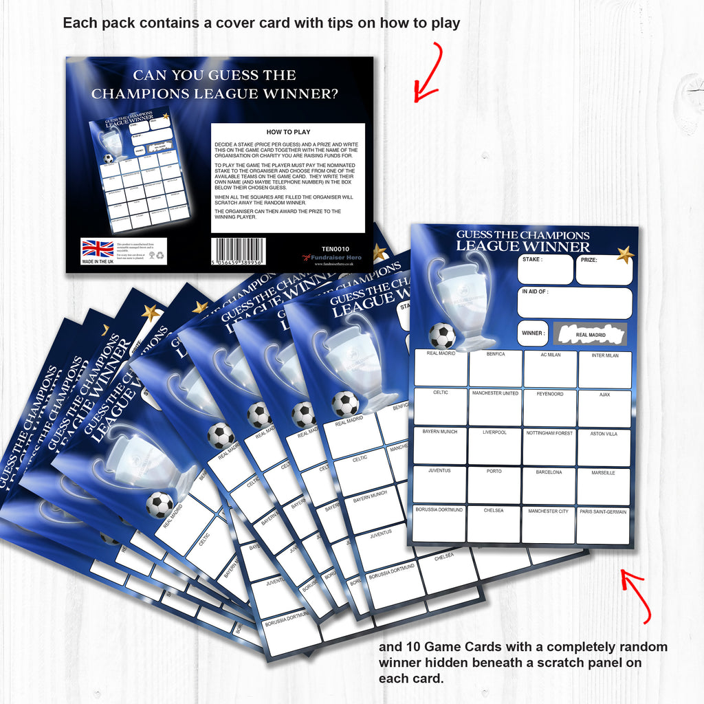Pack of 10 - Champions League Winners Fundraising Scratch Cards. A5 Size - 20 Names - 330gsm Card