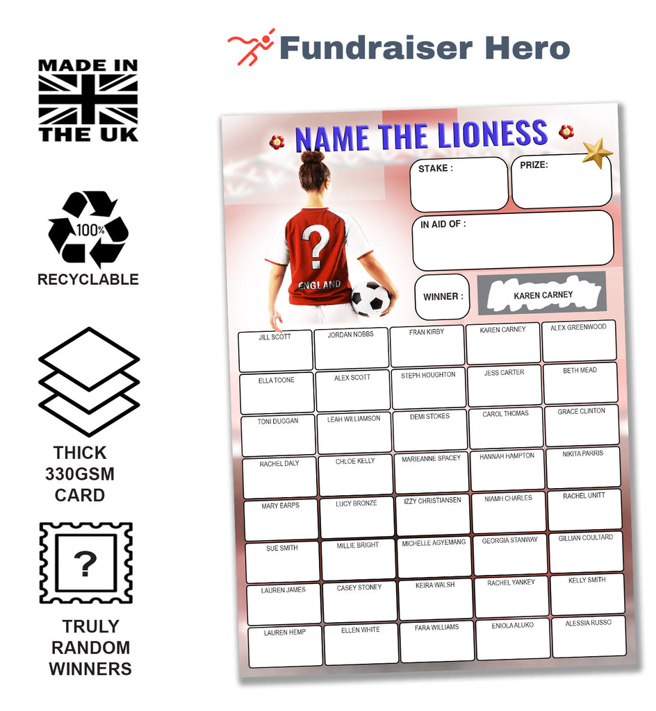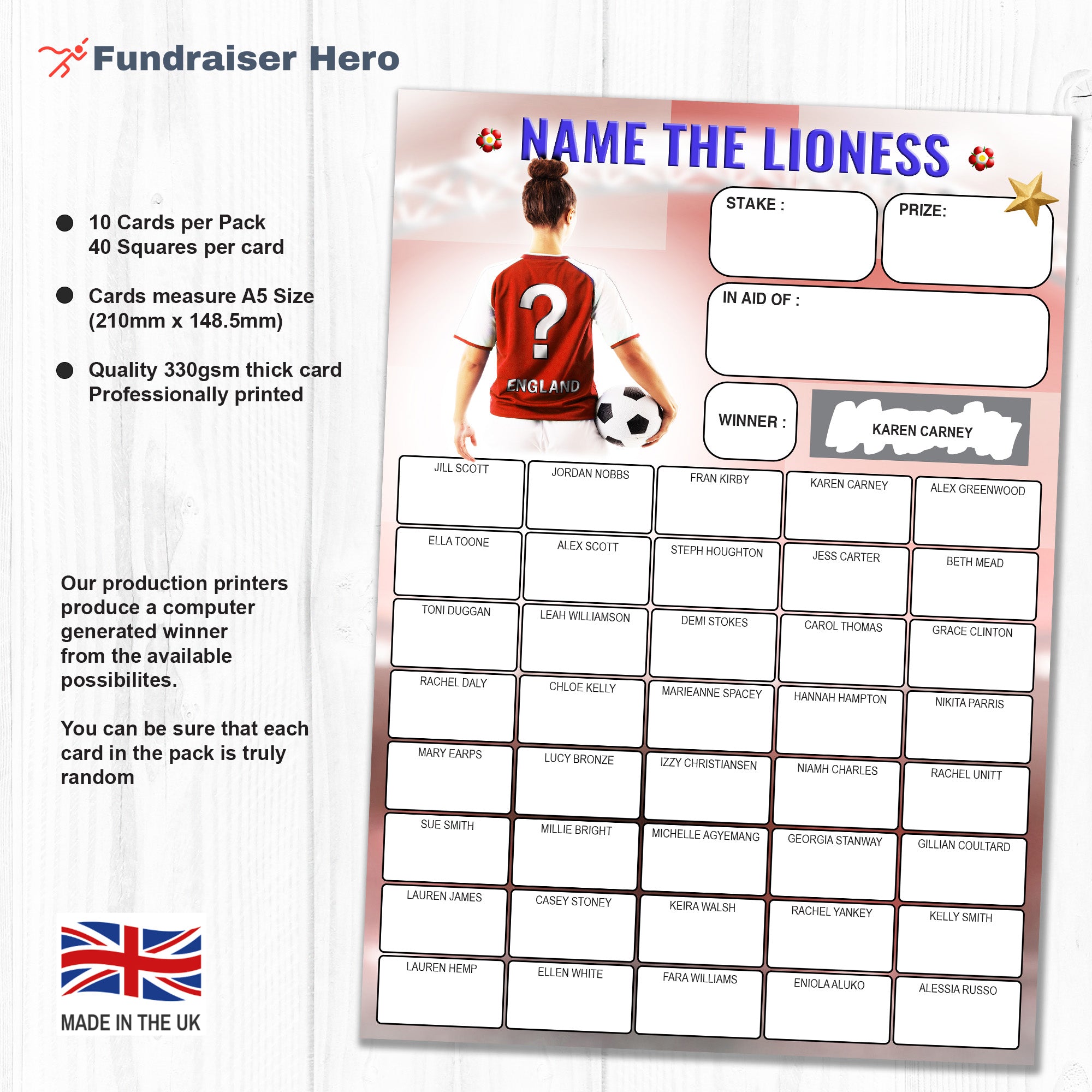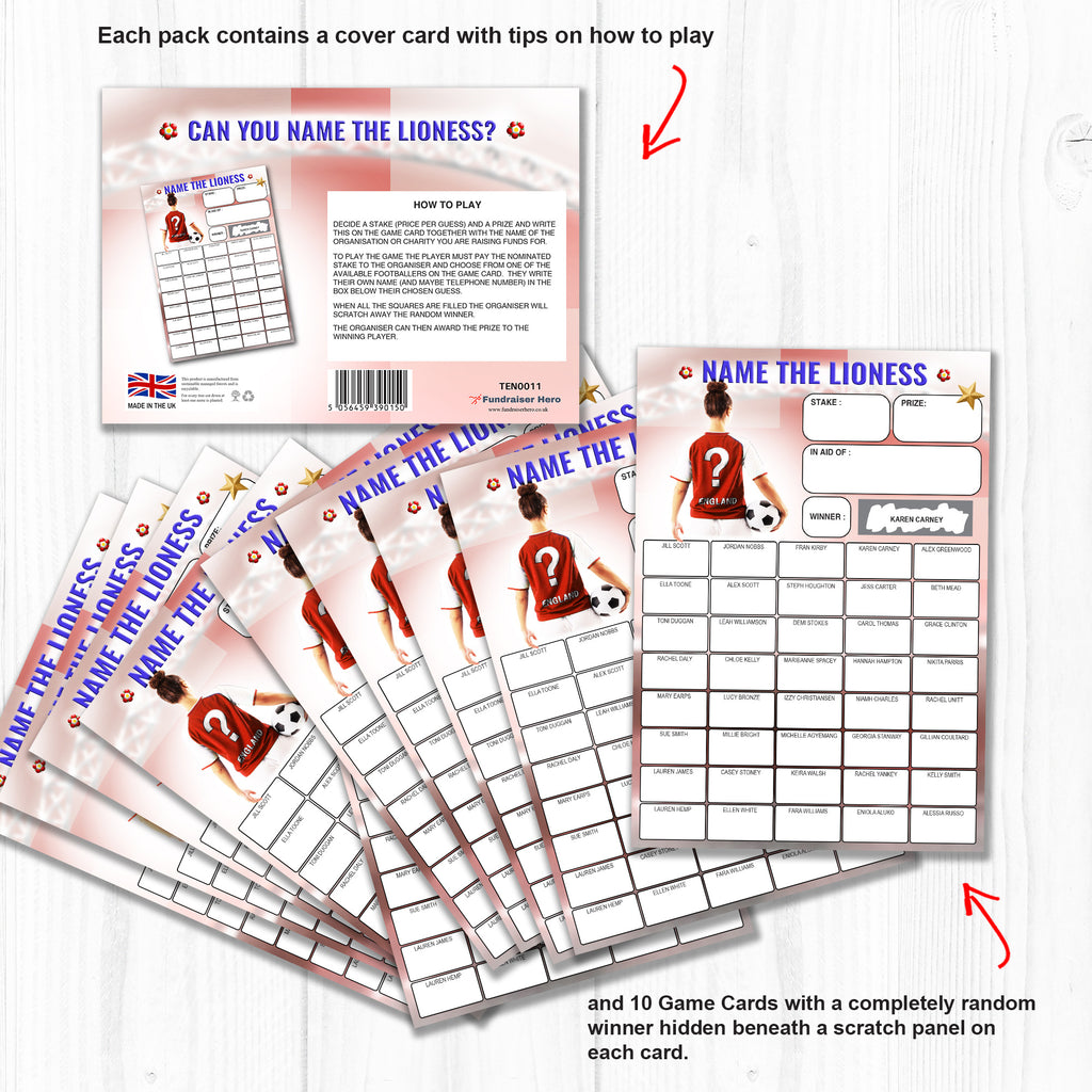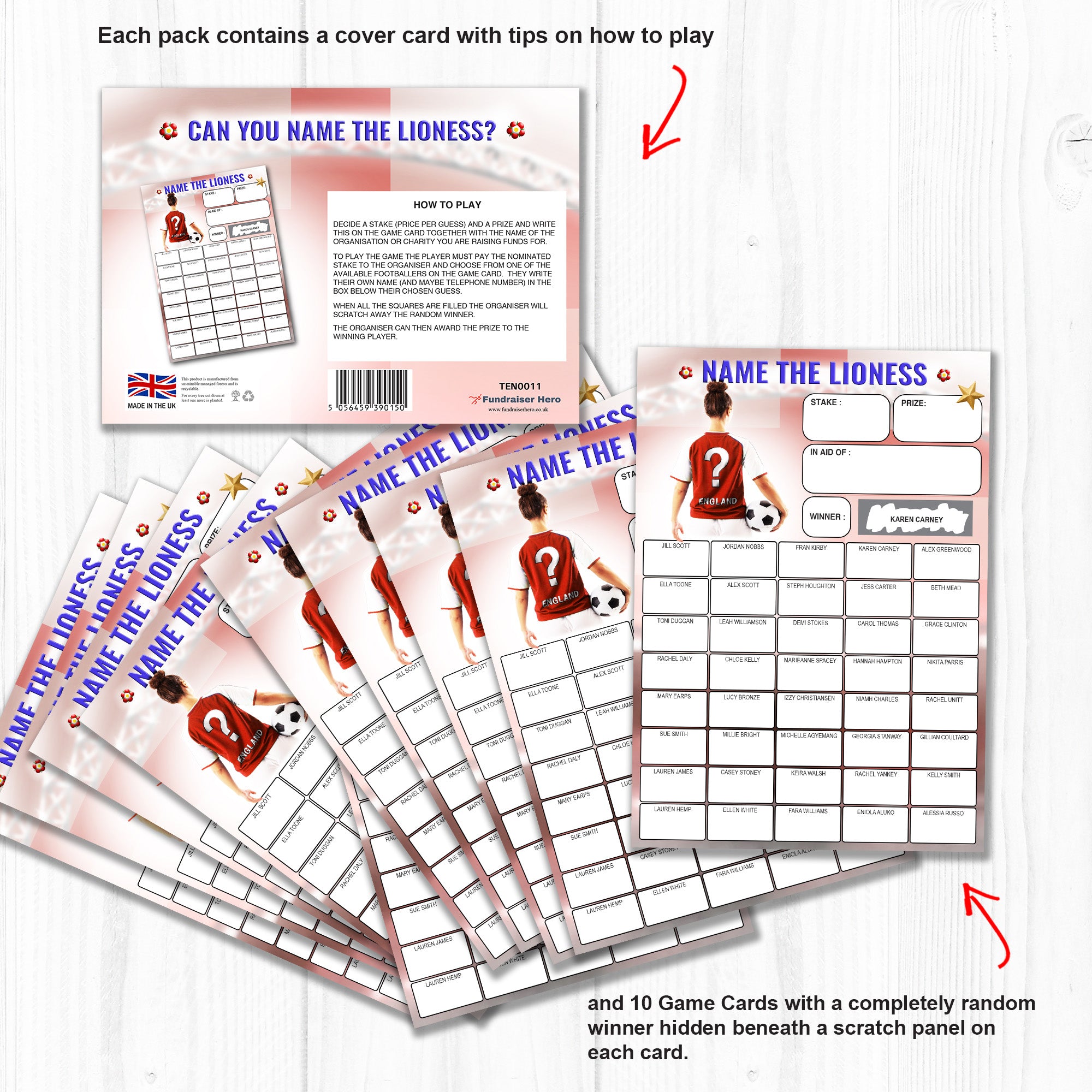 Pack of 10 - England Womens Lionesses Fundraising Scratch Cards. A5 Size - 40 Names - 330gsm Card