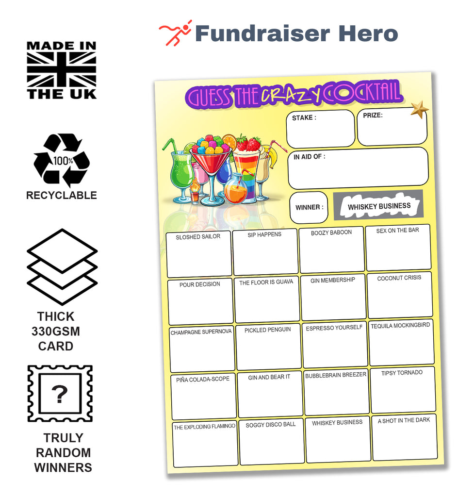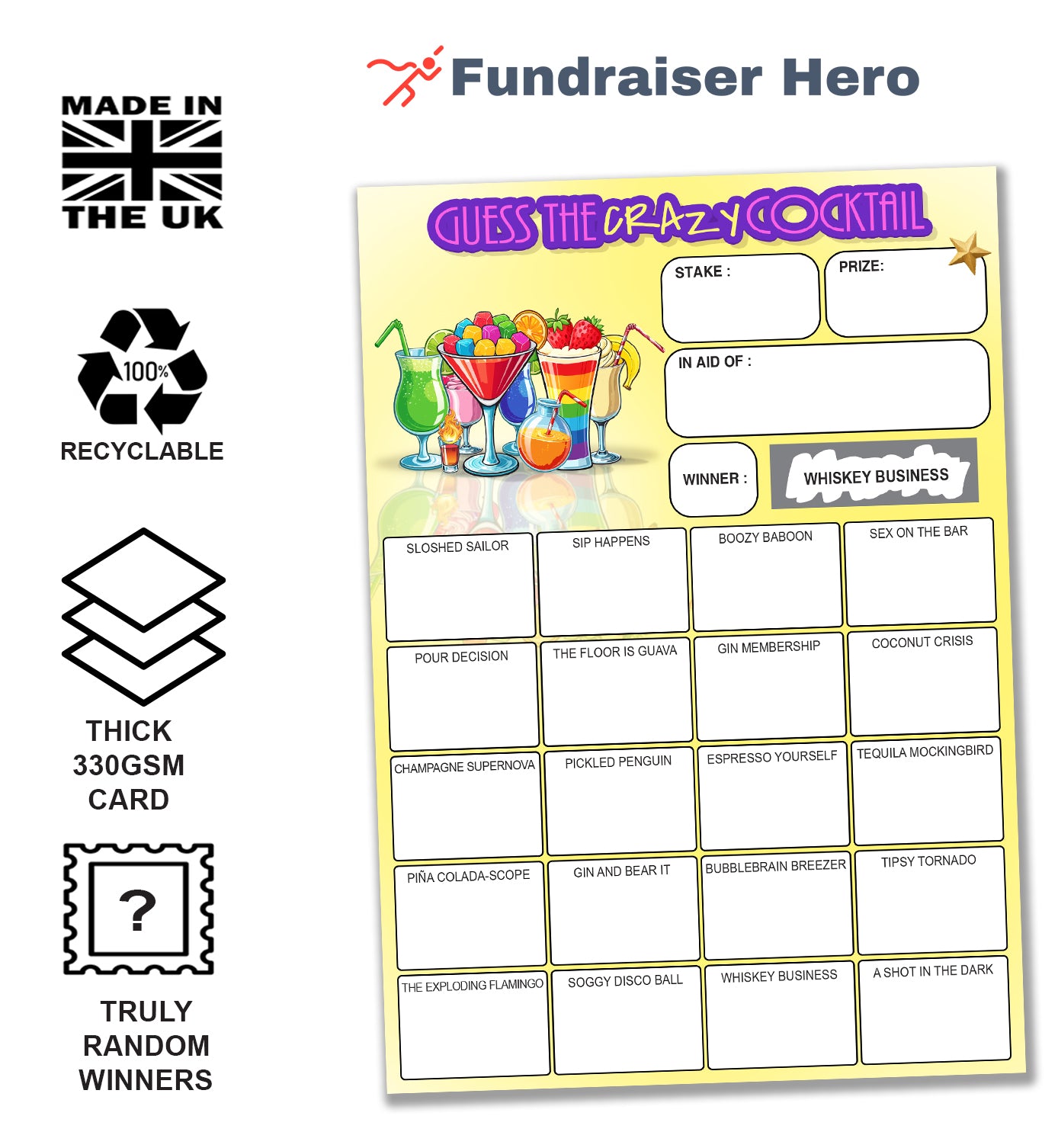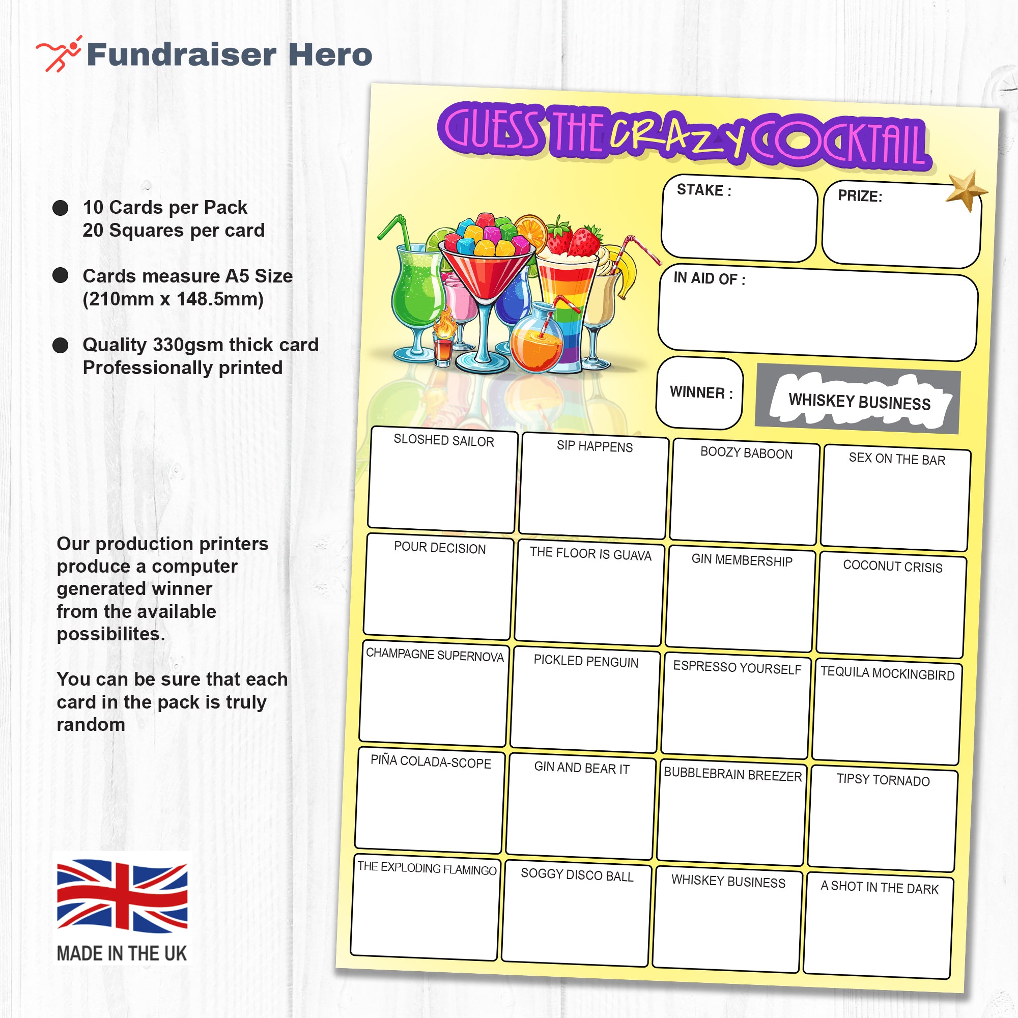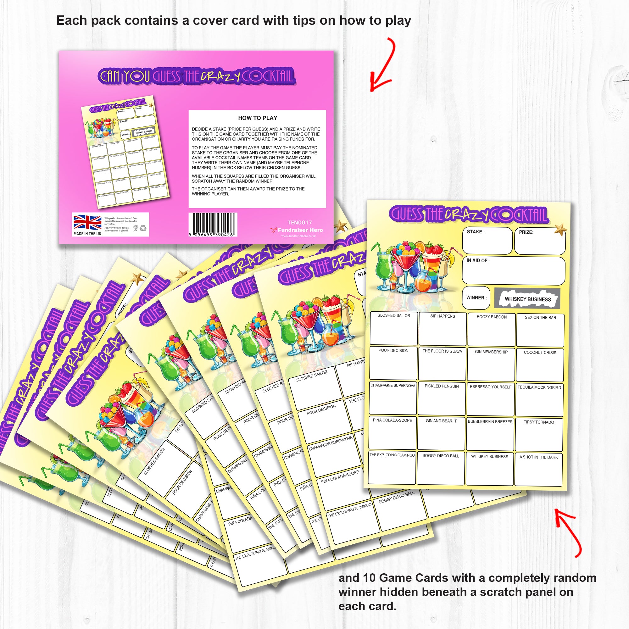 Pack of 10 - Guess the Crazy Cocktail Fundraising Scratch Cards. A5 Size - 20 Names - 330gsm Card