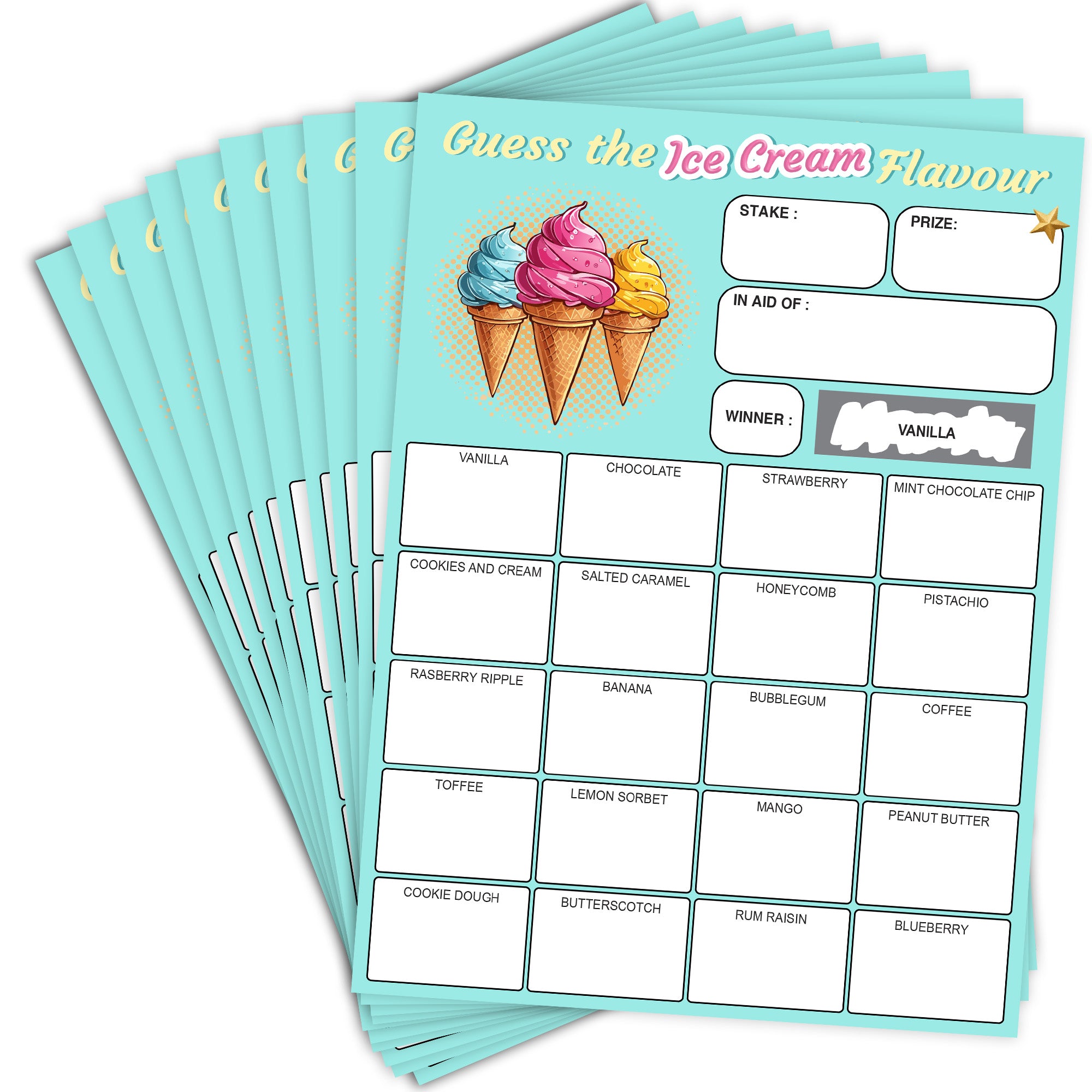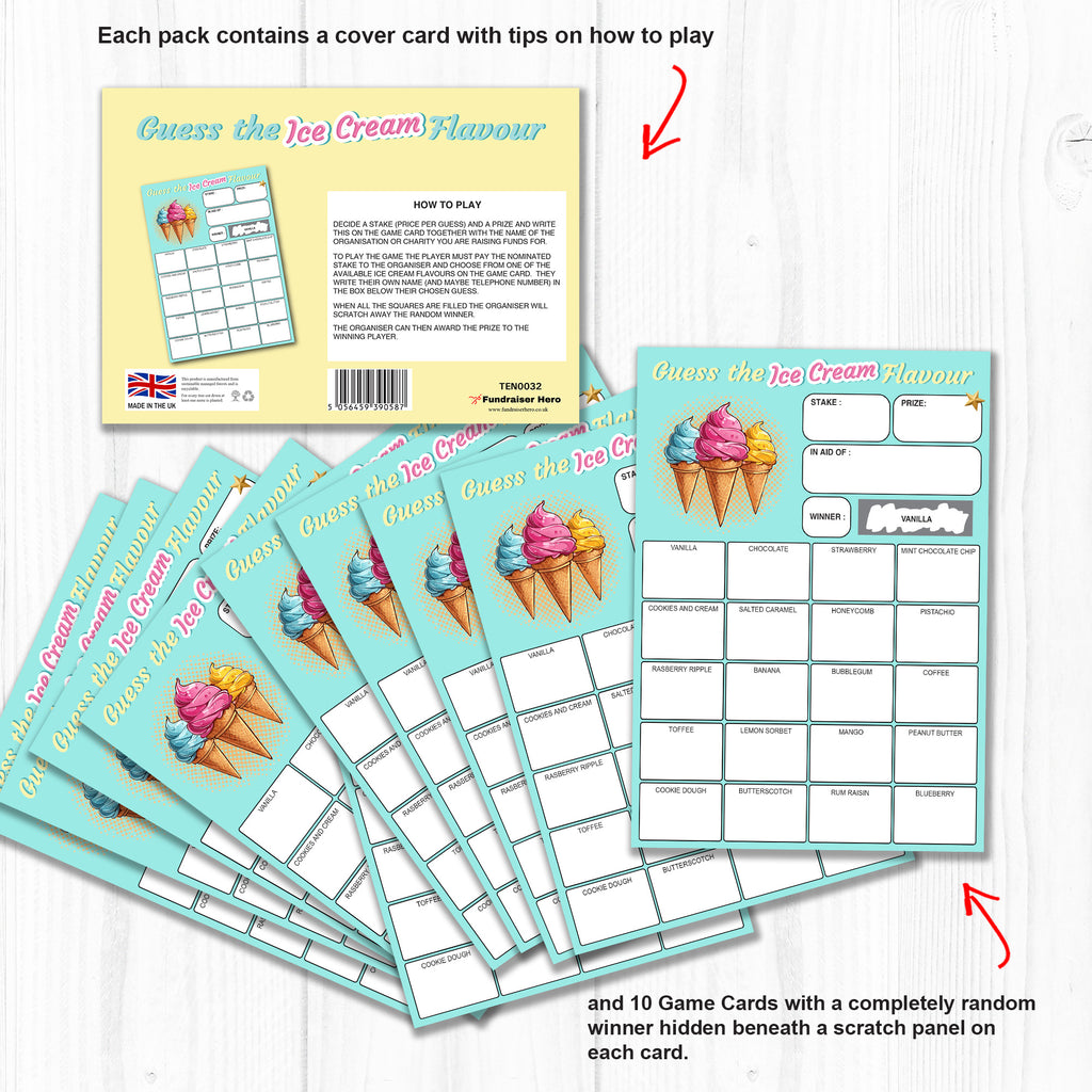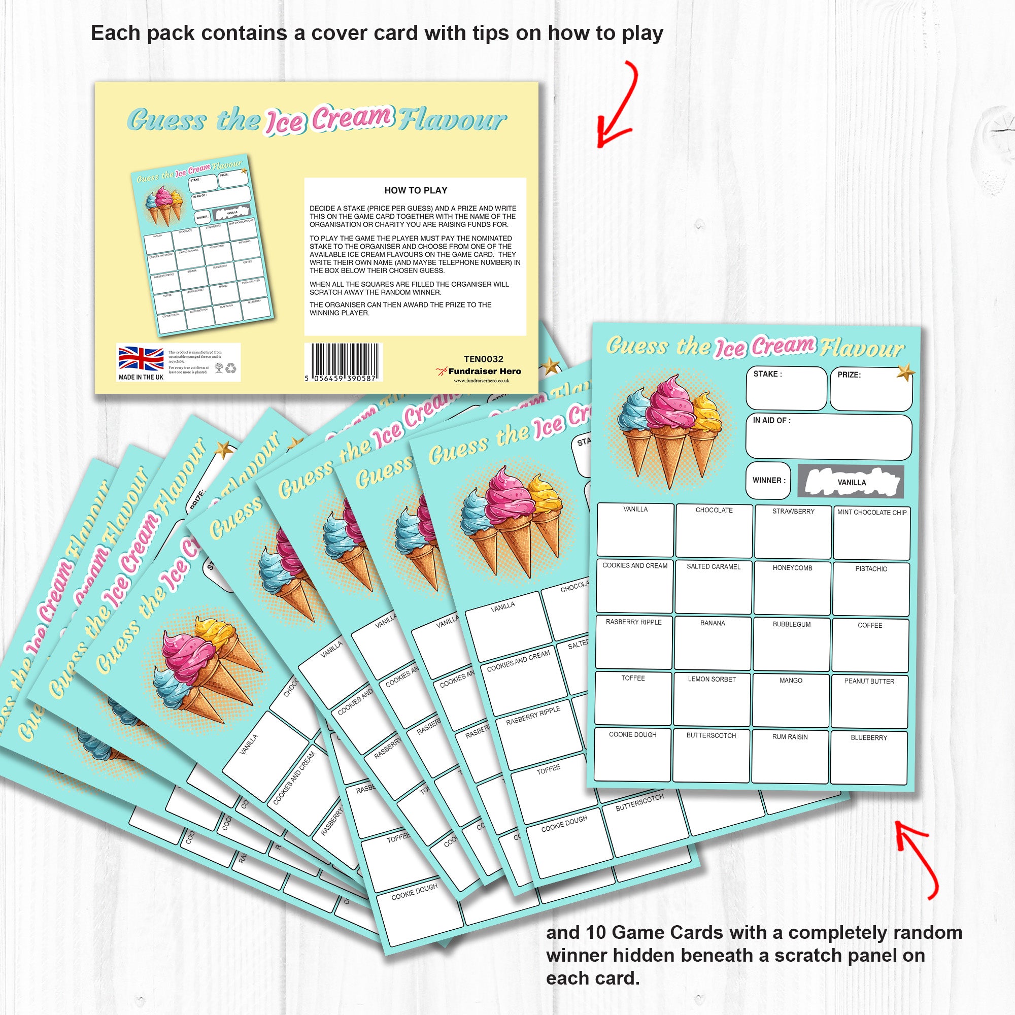 Pack of 10 - Guess the Ice Cream Flavour Scratch Cards. A5 Size - 20 Names - 330gsm Card