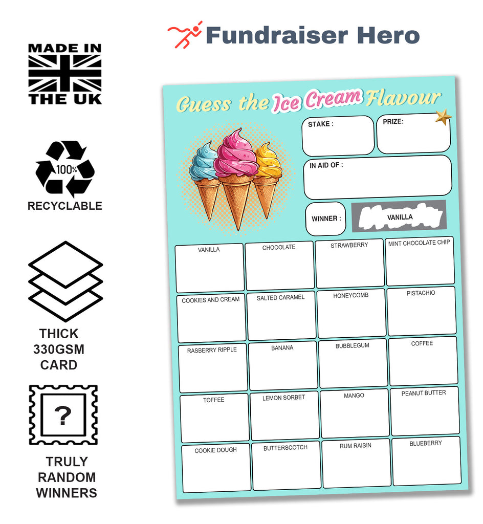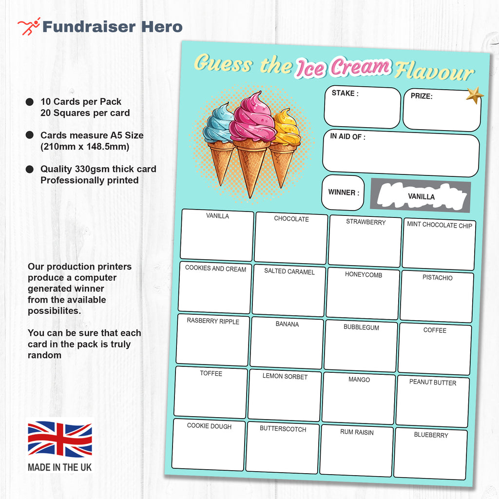 COMPUTER GENERATED RANDOM WINNERS ⭐ The scratch panel on each card hides a randomly generated ice cream flavour from the 20 available. Our production printers are linked to a computer generated routine that automatically picks a randomly generated winner when every card is printed. ⭐