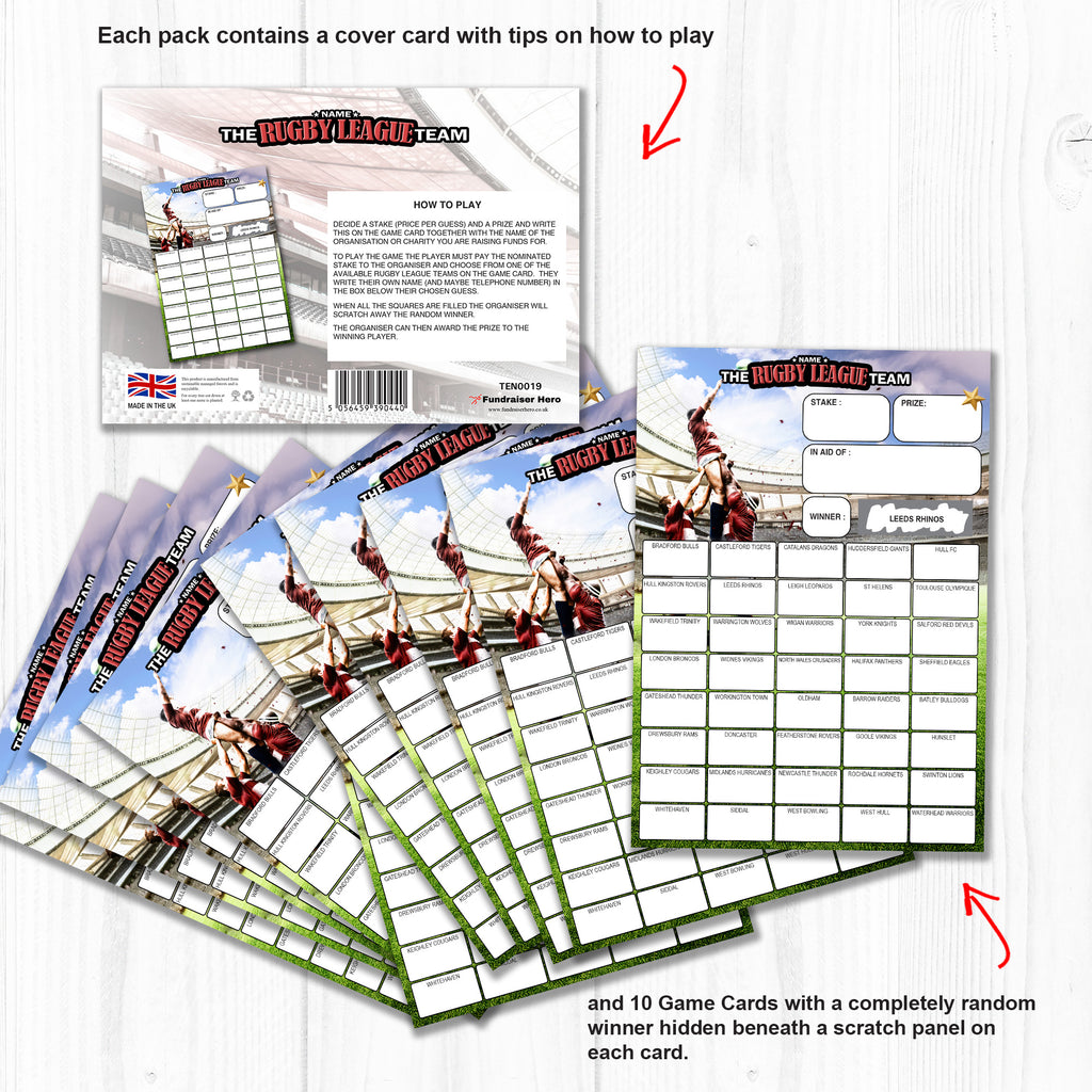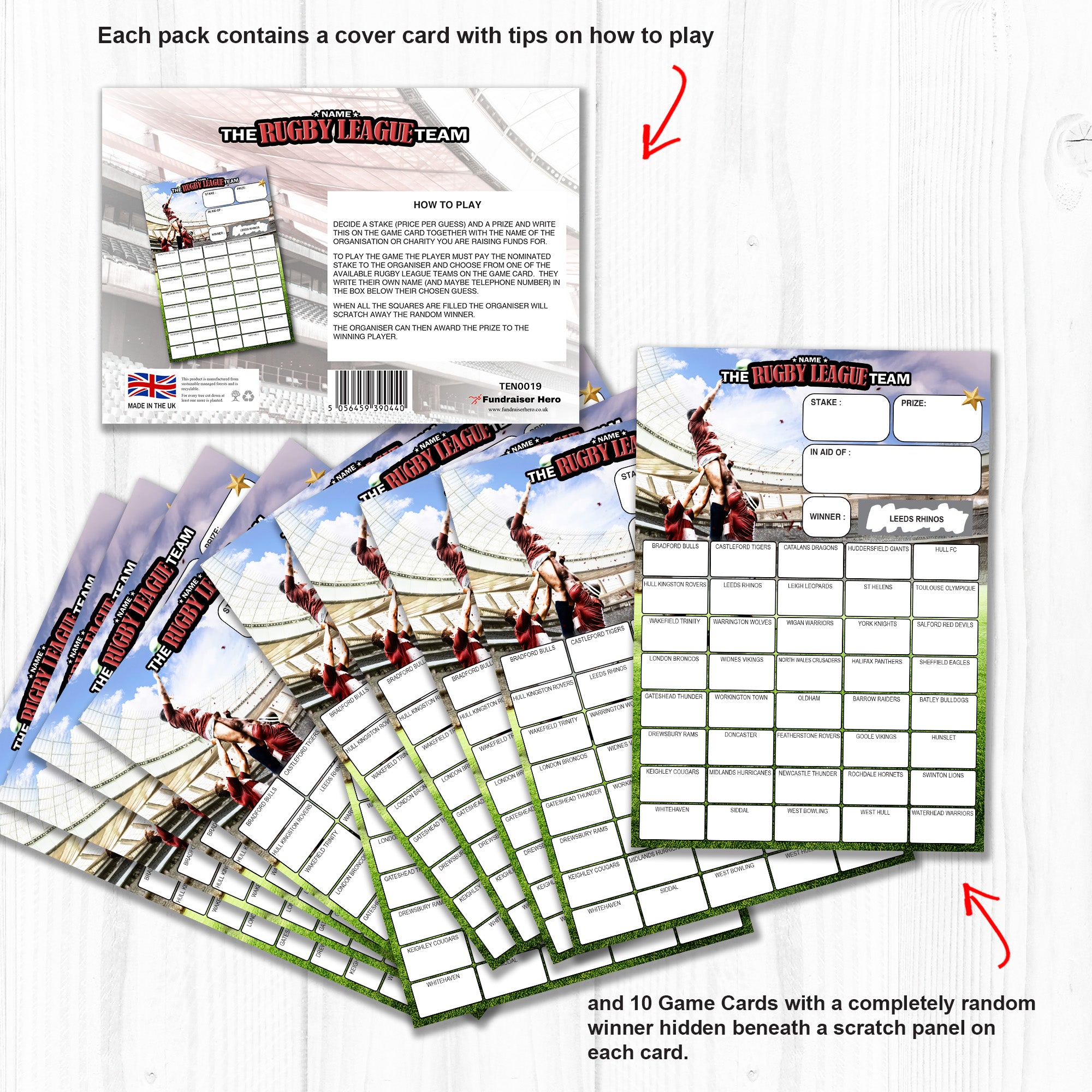 Pack of 10 - Name the Rugby League Team Scratch Cards. A5 Size - 40 Names - 330gsm Card